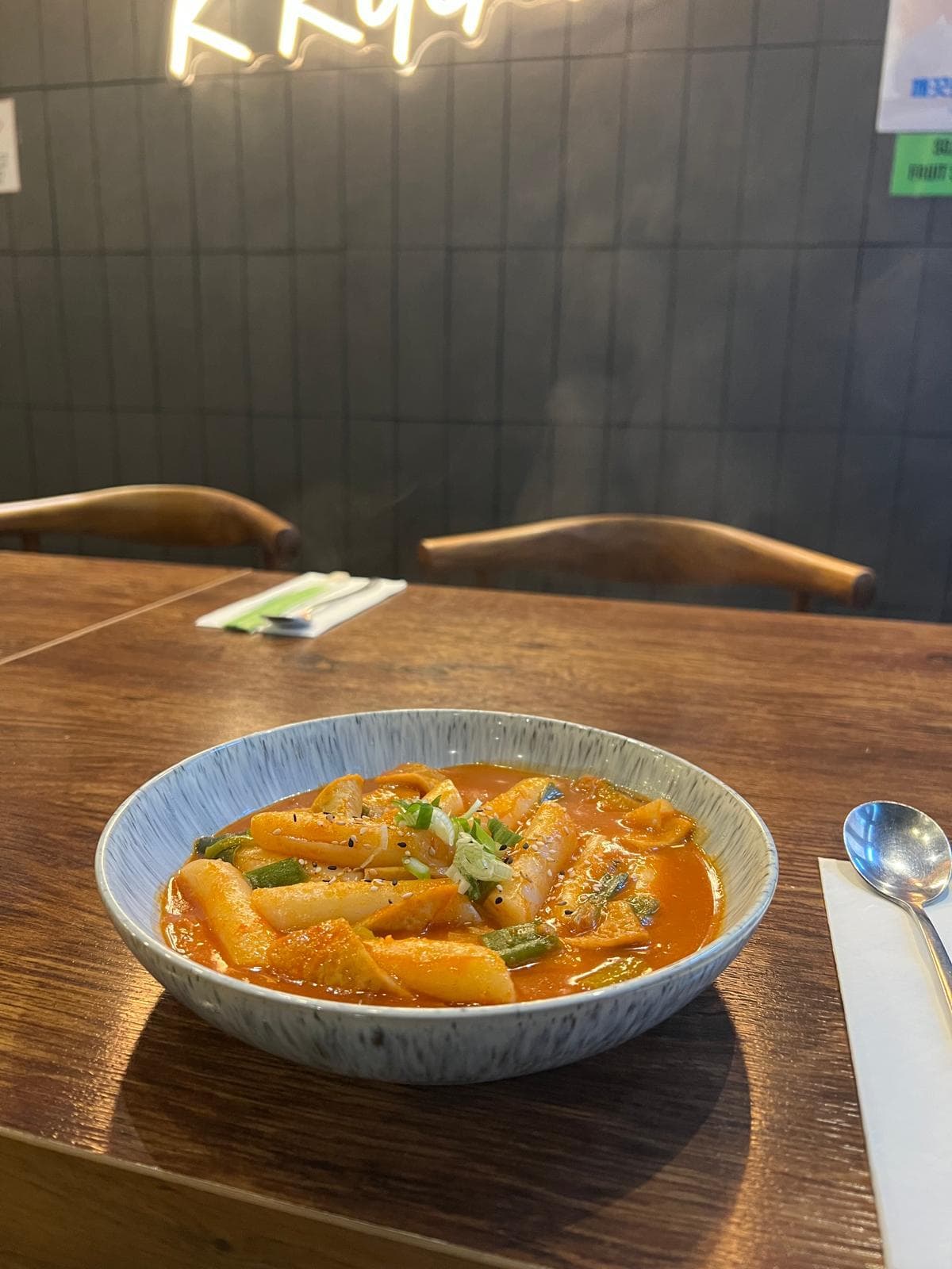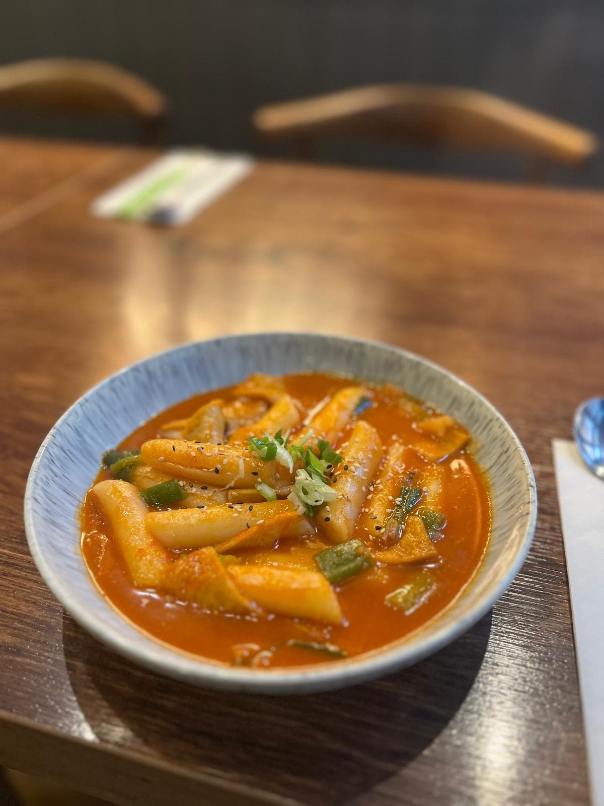 Korean thick rice cake, fish cake and vegetables in spicy sauce (add cheese for £1)